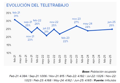 In Spain, hybrid work has now reached a point of stability and maturity. According to the latest InfoJobs and INE data, around 25% of employees currently telework in some capacity, with the hybrid model clearly dominating over fully remote setups.